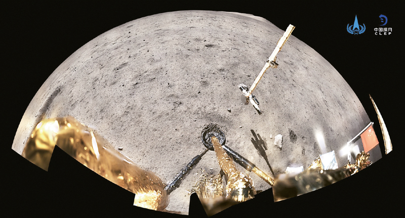 2020年12月4日,國家航天局公布了探月工程嫦娥五號探測器在月球表面國旗展示的照片。嫦娥五號著陸器和上升器組合體全景相機環(huán)拍成像,五星紅旗在月面成功展開,此外圖像上方可見已完成表取采樣的機械臂及采樣器。 新華社發(fā)(國家航天局供圖)